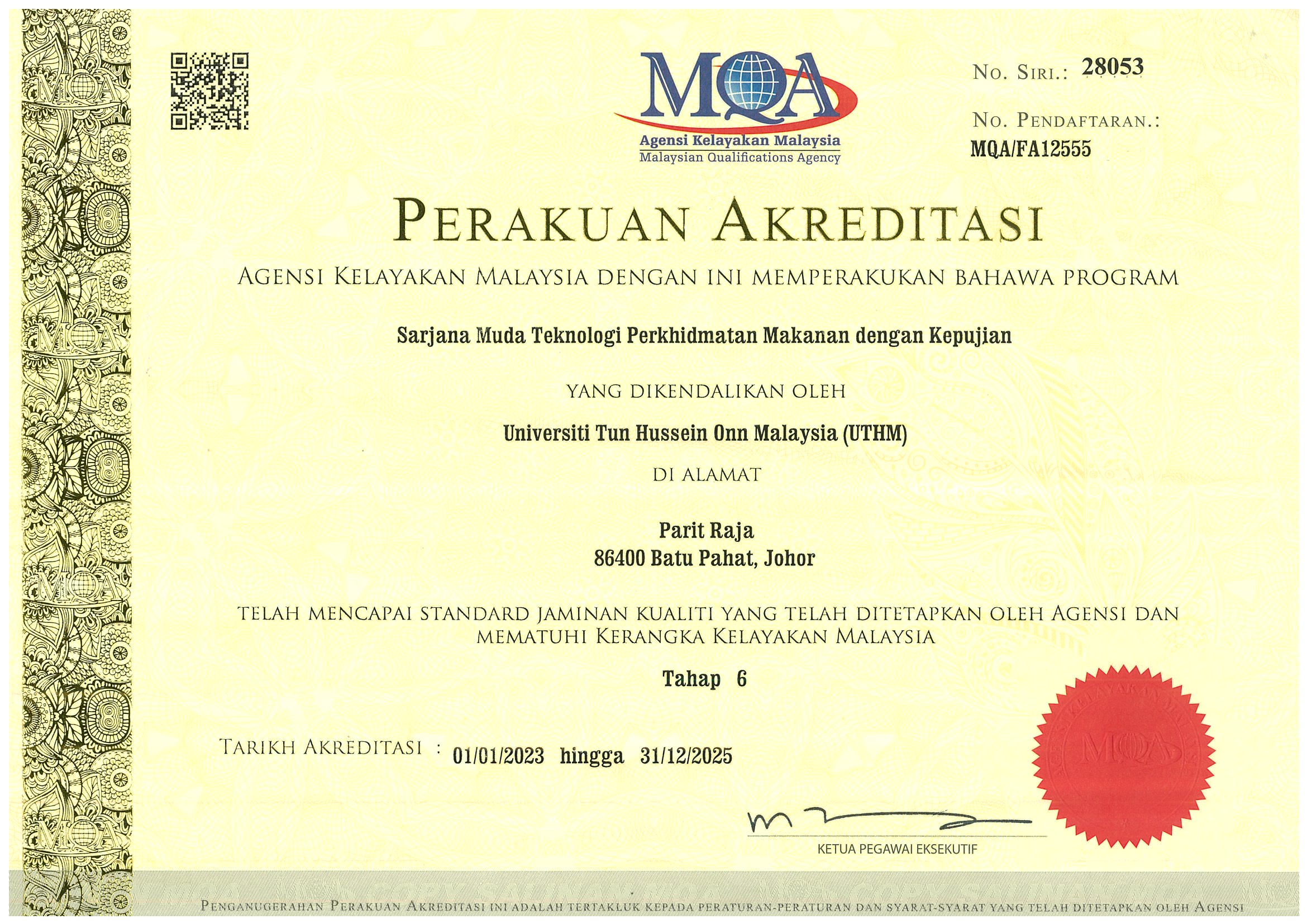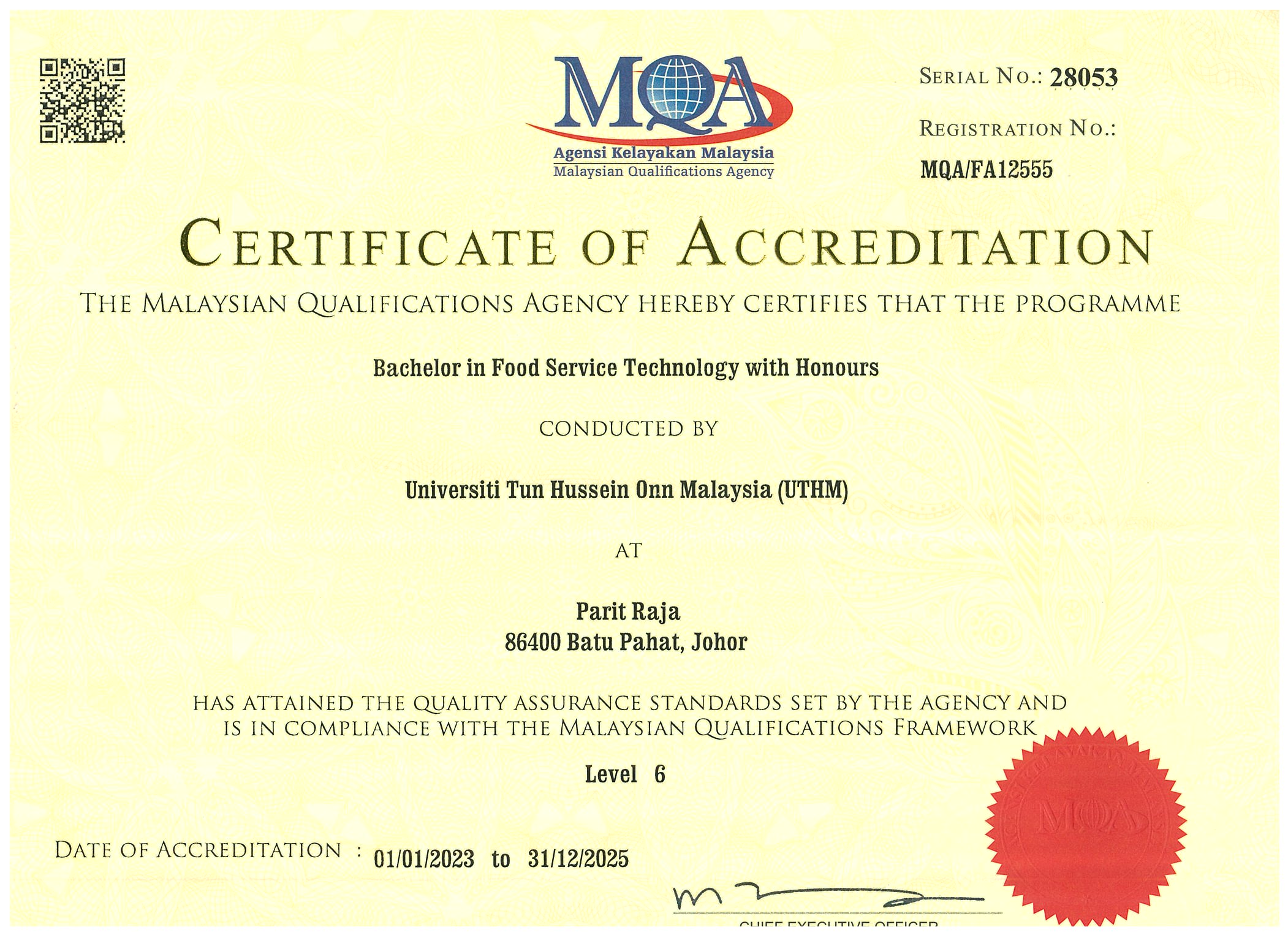 All Bachelor Technology programmes offered by FPTV are accredited by the Malaysian Qualifications Agency (MQA) and compliance with the Malaysian Qualifications Framework (MQF). In addition, our Bachelor in Food Service Technology with Honours is also accredited by the Malaysia Board of Technology (MBOT)