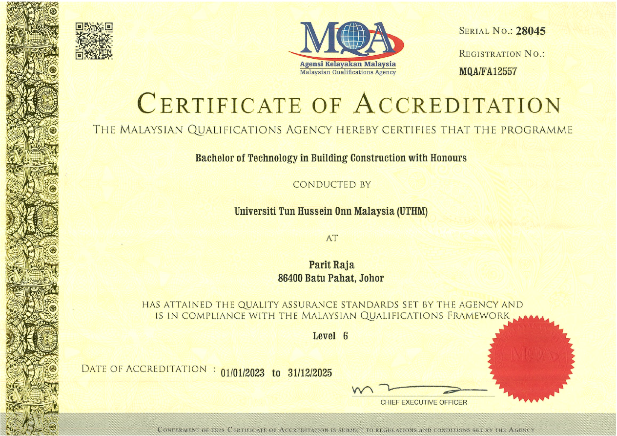 All Bachelor Technology programmes offered by FPTV are accredited by the Malaysian Qualifications Agency (MQA) and compliance with the Malaysian Qualifications Framework (MQF). In addition, our Bachelor of Technology in Building Construction with Honours is also accredited by the Malaysia Board of Technology (MBOT).