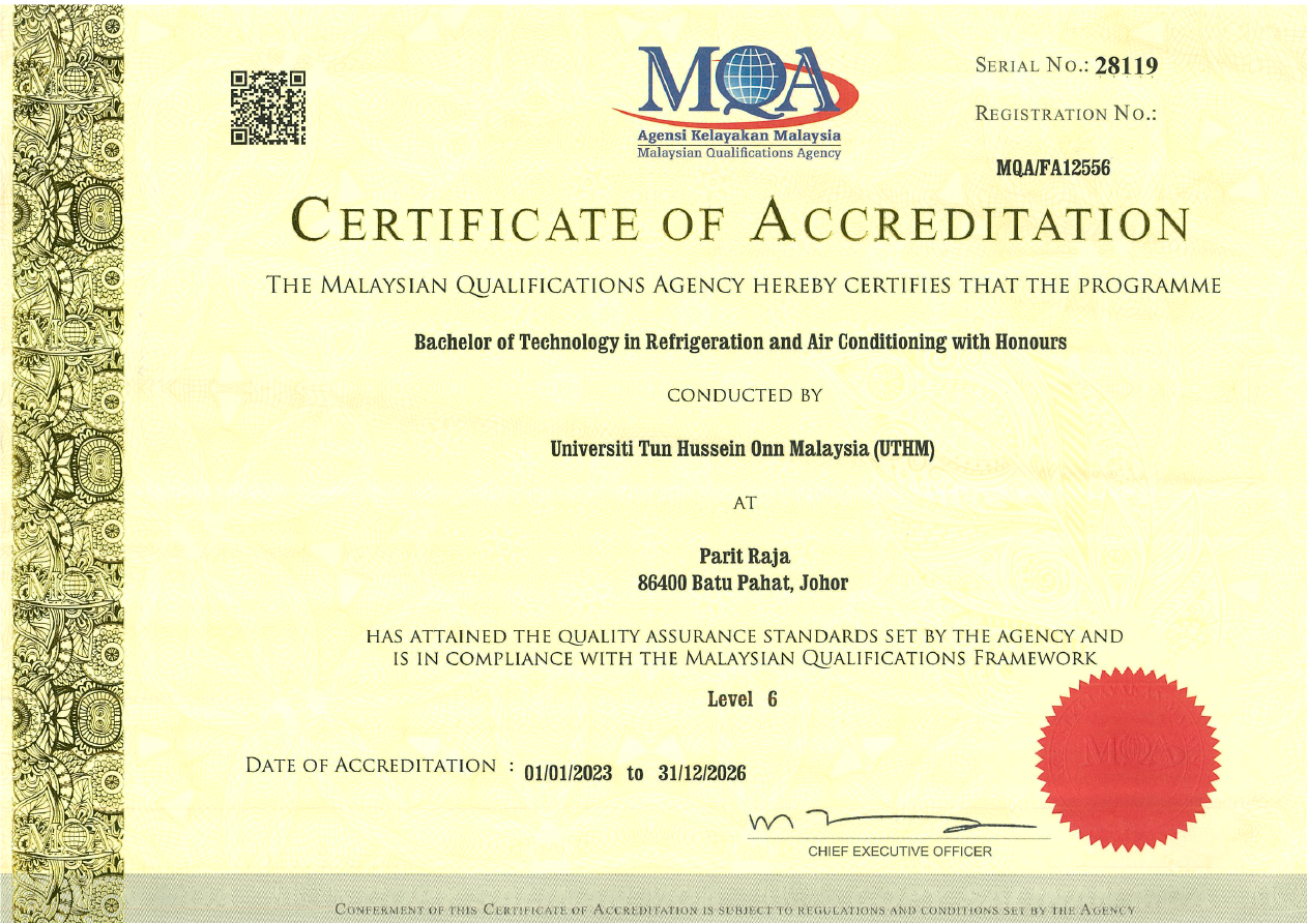 All Bachelor Technology programmes offered by FPTV are accredited by the Malaysian Qualifications Agency (MQA) and compliance with the Malaysian Qualifications Framework (MQF). In addition, our Bachelor of Technology in Refrigeration and Air Conditioning with Honours is also accredited by the Malaysia Board of Technology (MBOT).