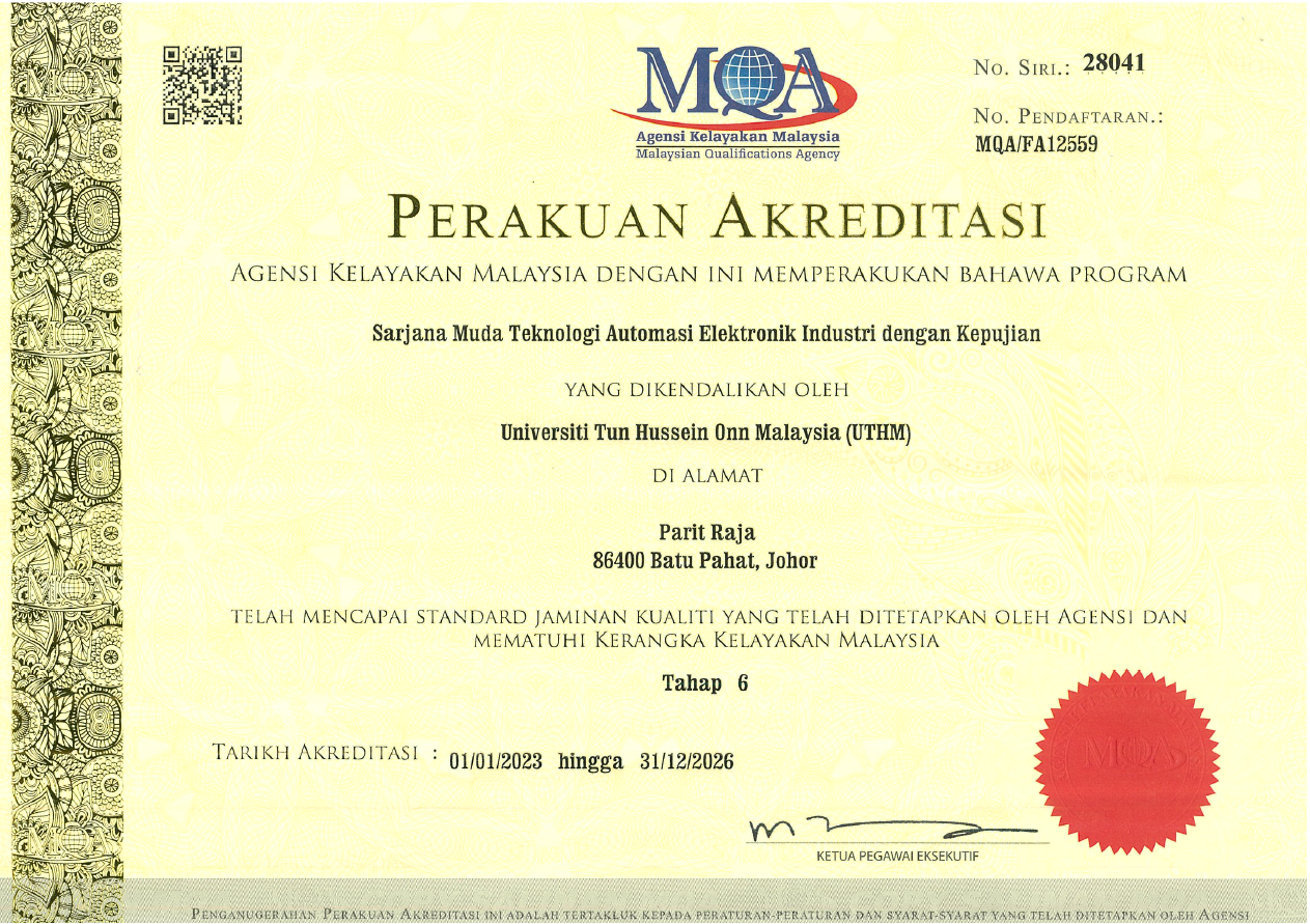 All Bachelor Technology programmes offered by FPTV are accredited by the Malaysian Qualifications Agency (MQA) and compliance with the Malaysian Qualifications Framework (MQF). In addition, our Bachelor of Technology in Industrial Electronics Automation with Honours is also accredited by the Malaysia Board of Technology (MBOT).