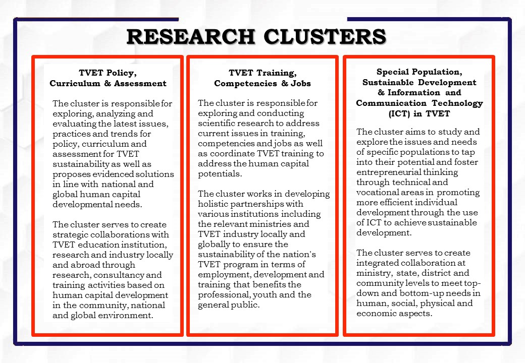 Advanced Centre for Technical and Vocational Education (ACTiVE) is a research centre under the Faculty of Technical and Vocational Education, Universiti Tun Hussein Onn Malaysia which is committed to empowering and initiating research based on ethical, systematic and scientific principles to enhance the quality of Technical and Vocational Education and Training (TVET) at the national and global level.